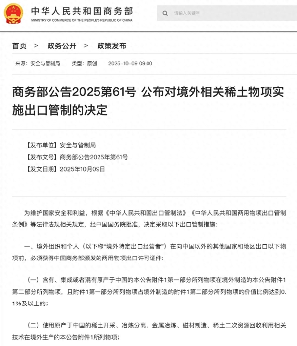 "乾坤孕宝,坤舆藏珍,有物曰稀土,蕴天地之灵,承造化之奇。"正如《稀土赋》中所描述的,稀土这种被誉为"工业维生素"的战略资源,如今已成为大国博弈的重要筹码。中国商务部2025年第61号公告明确规定,境外组织和个人在出口含中国稀土成分的物项前,必须获得中国商务部颁发的两用物项出口许可证件。即便是境外制造产品中中国稀土技术价值占比达0.1%,同样纳入管制范畴。
