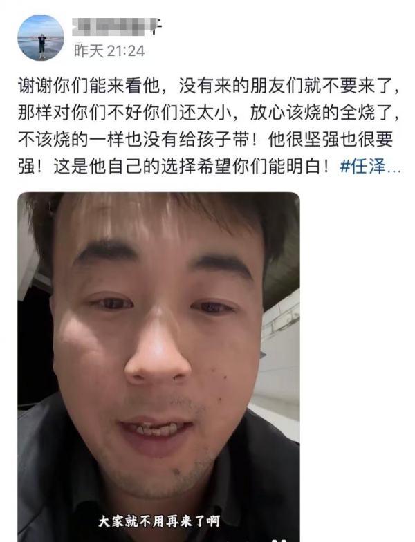 当下,任泽宾的葬礼已经举行,其哥哥告知,任泽宾是4月2日早上10点多去世的,4月3日下午3点已下葬,哥哥感谢大家能来看他,而那些没有来的朋友也不要来了,对于弟弟的离去,哥哥悲伤欲绝,双眼哭得通红,他说这是弟弟的选择,希望大家能明白。