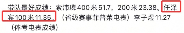 在平时的训练中,任泽宾不仅认真还能吃苦,其体育成绩也非常优秀,百米短跑最好成绩是11.35秒,已经是二级运动员的成绩了。