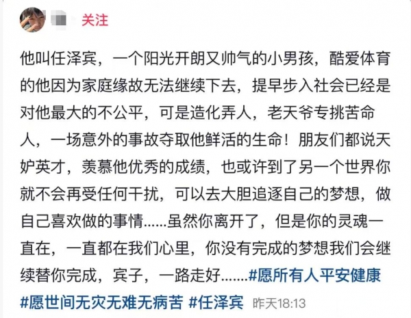从好友的发文得知,任泽宾阳光帅气,性格开朗,他生酷爱跑步,只不过因为家庭原因他无法继续跑下去,小小年纪便提早步入了社会,可惜老天并没有眷顾这个小男孩,一场意外夺走了他的生命。