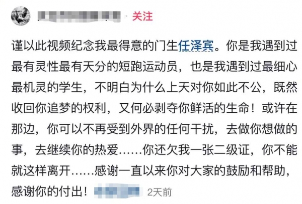 其教练也悲痛发文,为任泽宾的突然离去而感到心痛,教练称任泽宾是他最得意的门生,也是他遇到过最有灵性的短跑运动员,可见任泽宾在跑步方面,是多么有天赋。