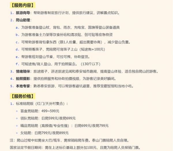 某社交平台上,一名泰山陪爬在广告中描述了登山过程中的特色服务,"在你累的时候给你跳舞(抖音舞蹈,可提前点),在没精神时放DJ,节凑感上山!""拍转场视频包剪辑,绝对出片包后期""打鸡血式鼓励服务,情绪价值拉满"。