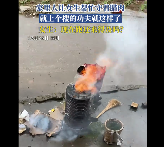 家里人让女生帮忙守着腊肉,就上个楼的功夫就这样了 2025-12-30 17:34 12月28日,四川,一女子在熏腊肉,让女生帮忙守着腊肉,女子没想到自己就上个楼的功夫熏腊肉的地方就燃起来了。 女生:现在跑还来得及吗?