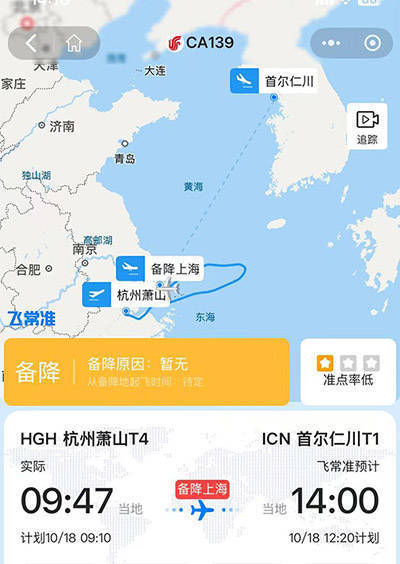 "飞常准"APP显示,这趟国航CA139航班,于18日9时47分从杭州萧山国际机场起飞,计划当地时间14时抵达首尔仁川机场,显示航班于11时07分备降至上海浦东。