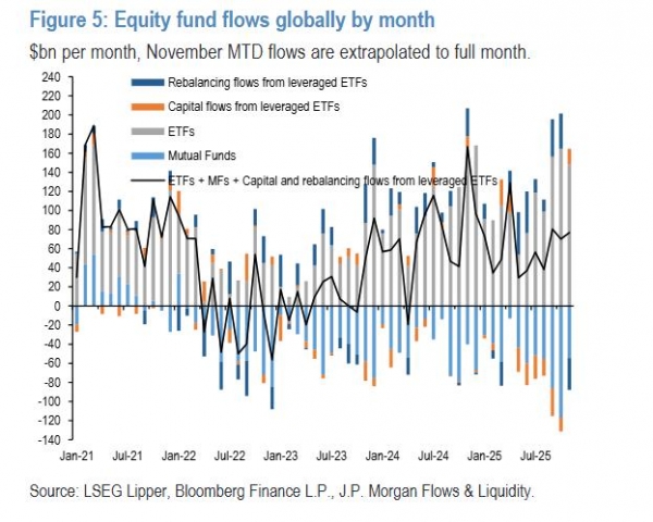 然而,在股票市场,情况恰恰相反。散户投资者正积极"逢低买入"。截至11月18日,全球股票ETF的月度至今(MTD)净流入高达960亿美元。按此速度推算,整个11月的股票ETF净流入可能达到1600亿美元,与前两个月的热度相当。