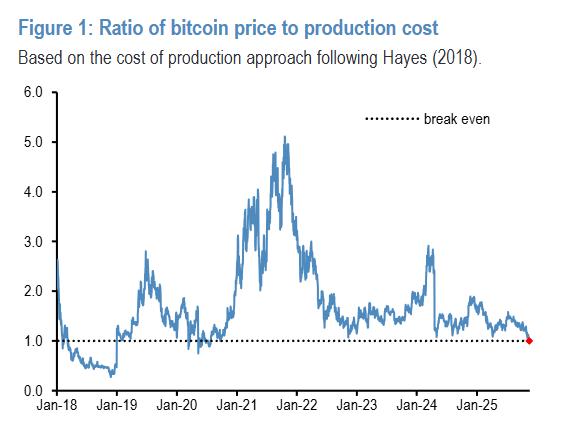 比特币价格跌破摩根大通估算的9.4万美元生产成本,为2020年7月以来首次。这一生产成本基于Hayes(2018)的成本计算方法得出,反映了挖矿成本对价格的支撑作用失效。