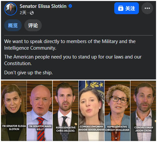 据美国全国公共广播电台(NPR)11月20日报道,当地时间19日,六名民主党众议员在社交媒体"脸书"平台向美国军方和情报界人士发表讲话,称"你们可以拒绝非法命令",并多次重复这句话,最后强调"你们必须拒绝非法命令"。