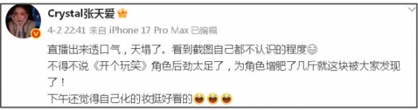 除了这起瓜外,还有爆料称张天爱在忙着备孕。在《浪姐》初见面直播镜头中,张天爱浮肿的样貌遭到了不少质疑,样貌变化大到圈内人都差点没有认出来,张天爱现场解释可能是妆容太素了,以前见面都是明艳的浓妆。事后,她还特意发文回应是为戏增肥,调侃看《浪姐》截图自己都认不出来。从她晒出的角色图来看,脸颊肉跟《浪姐》画面中的不是同一款胖。