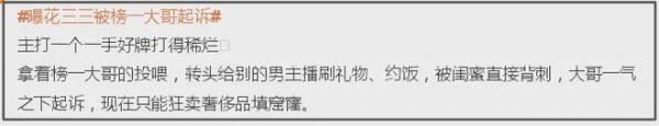 只是近期这种平衡状态被打破了,花三三被曝在这段感情中有异心,养"小男友"被榜一大哥发现后抛弃了,还跟她索要过往赠送的礼物,导致花三三不断变卖奢侈品筹钱,还试图模仿大佬新欢模样挽回。
