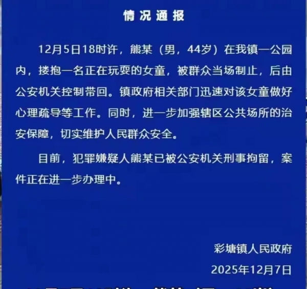 通报说12月5号傍晚6点多,44岁的熊某在镇上公园搂抱正在玩的女童。