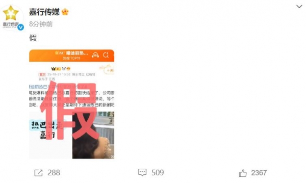 此前,10月27日,针对迪丽热巴和经纪公司切割快结束的话题,嘉行传媒发文打假。嘉行传媒官博晒出相关内容打上红色"假"字辟谣。