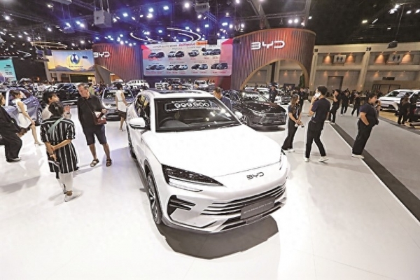 在泰国首都曼谷举行的泰国国际车展上,人们参观比亚迪展台。新华社发
