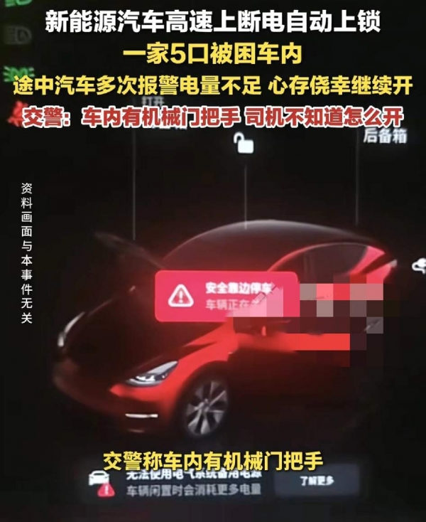 一家五口被锁死在没电的新能源车里。安徽高速上演惊魂一幕,民警砸窗救人发现机械开关就在手边。这场本可避免的险情,暴露了新能源时代最致命的安全盲区。