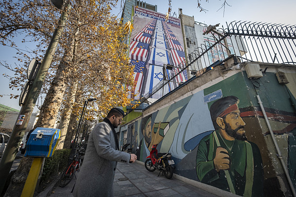 2026年1月6日,德黑兰,一块反美反以色列的广告牌。广告牌上描绘了美以士兵棺材的象征性图像,旁边是伊朗议会议长阿里·拉里贾尼的声明,写着"小心你们的士兵"。 视觉中国