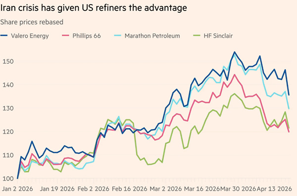 伊朗战事后,美国炼油商股价上涨。 《金融时报》制图