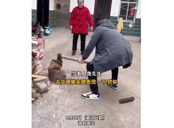 黄冈女婿回丈母娘家卖力表现,劈柴当场骨折,喊话返乡别乱逞能!
