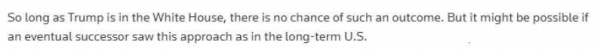 文章分析,美国未来存在多种可能。一是,美国重新退回其周期性出现的孤立主义阶段。还有一种是,美国总统对较弱对手发动更多军事行动,从而进一步削弱全球秩序。