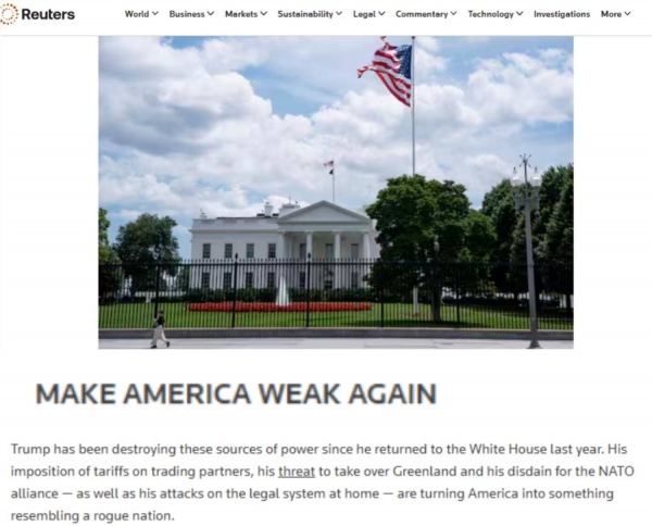 文章称,自去年重返白宫以来,美国总统一直在削弱这些同盟关系。他对贸易伙伴加征关税,威胁接管格陵兰岛,对北约联盟表现出轻蔑态度,同时还对国内法律体系发起攻击,这些都在使美国逐渐呈现出"离经叛道的国家"的特征。