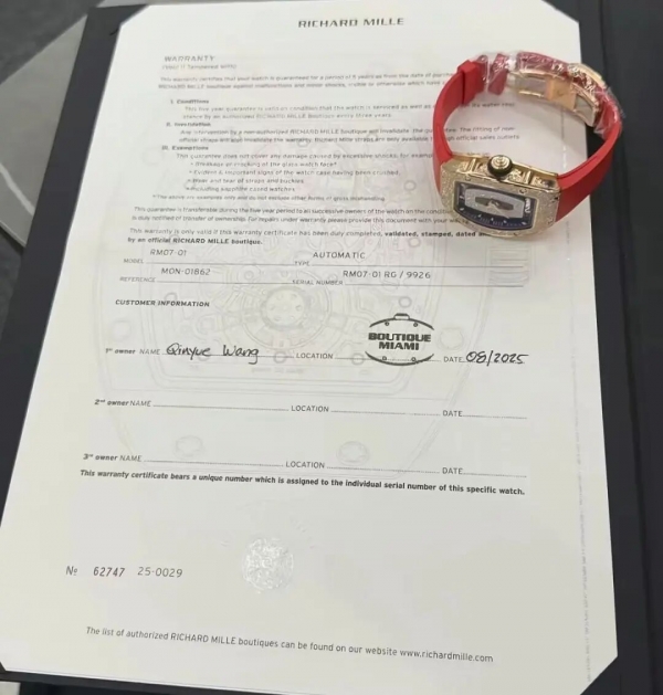 手镯是她半个月前花12万美元在柬埔寨购买的。价值260万港币的理查德米勒镶钻手表是在香港买的,也只才一个多月。