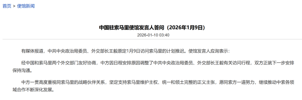 有媒体报道,中共中央政治局委员、外交部长王毅原定1月9日访问索马里的计划推迟。使馆发言人应询表示: