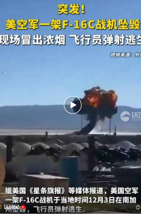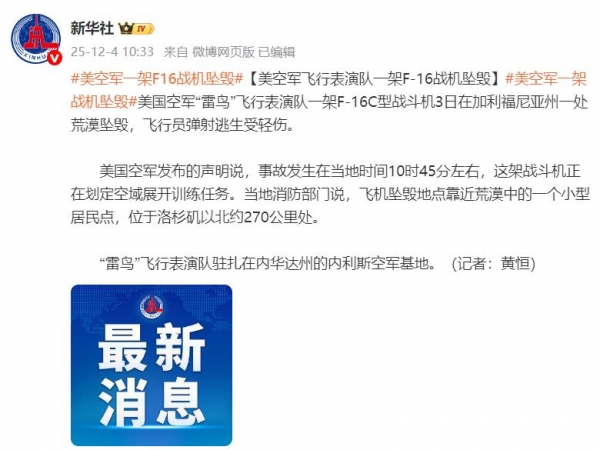 据新华社12月4日消息:美国空军"雷鸟"飞行表演队一架F-16C型战斗机3日在加利福尼亚州一处荒漠坠毁,飞行员弹射逃生受轻伤。