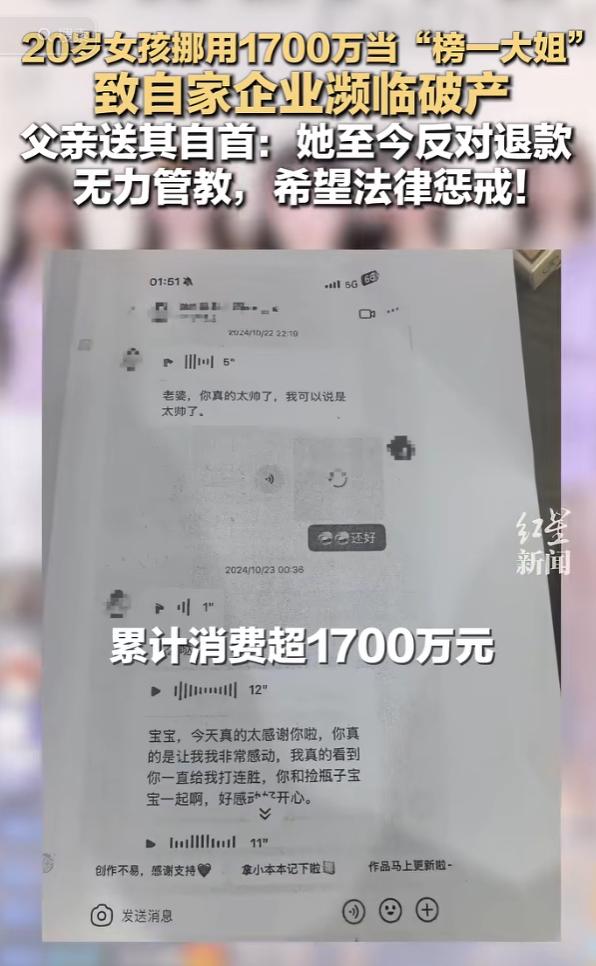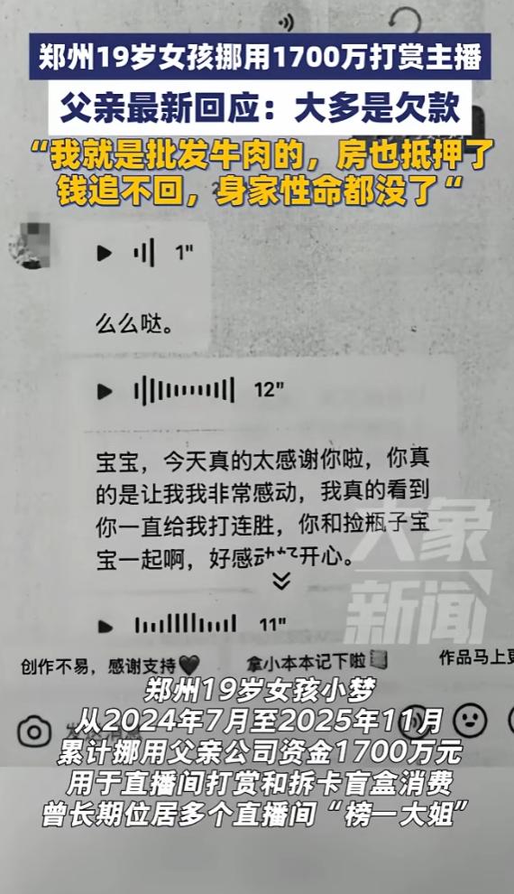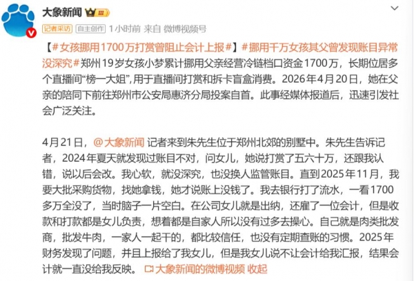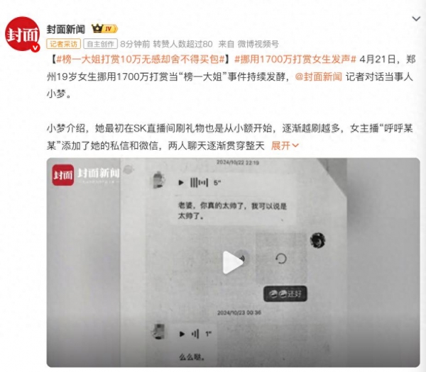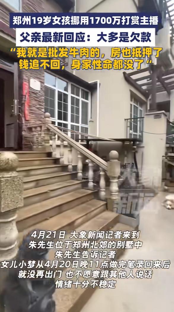 据大象新闻4月21日报道,郑州19岁女孩小梦在在家公司做财务,挪用1700万当榜一大姐, 家人发现后还以自杀威胁家人拒绝被没收手机。