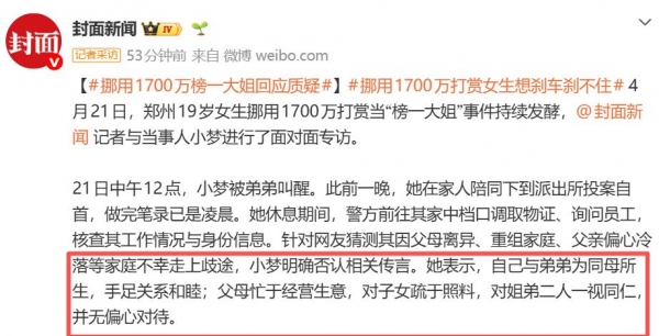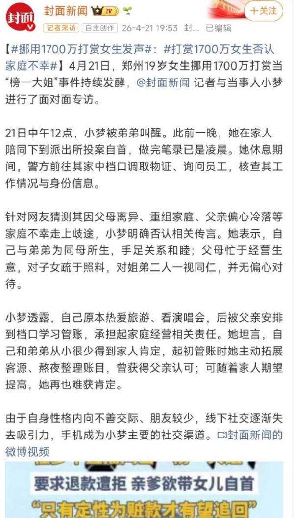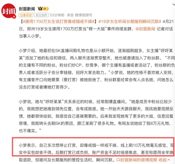 为什么小梦会坚持打赏1700多万呢?小梦接受封面新闻采访时,直言说打赏像戒烟戒不掉,并回应了网友质疑,否认自己不是因为家庭不幸才走上歧途的。