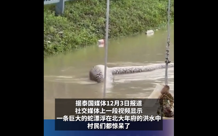 据泰国媒体12月3日报道,社交媒体上一段视频显示一条巨大的蛇漂浮在北大年府的洪水中,村民们都惊呆了,据报道,村民们说这条蛇喜欢偷偷吃村民的鸡,涨潮前一天,它被打死了还没有来得及埋葬,当水位上涨时这条蛇的尸体很可能被渔网卡住然后被冲走,它的头再次卡在下水道中,该片段拍摄当天是2024年12月1日,当时,蛇开始肿胀,而且开始散发出难闻的气味。