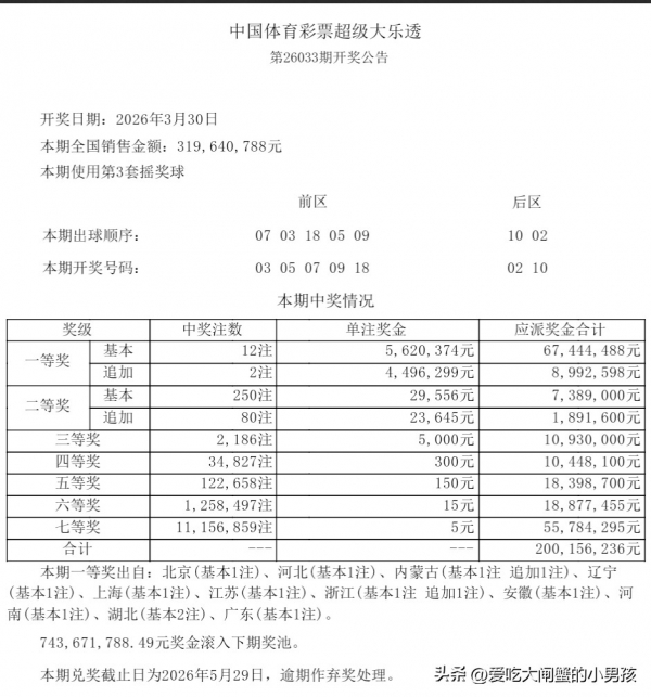 据体彩官方开奖公告显示,第26033期大乐透开奖号码为前区03、05、07、09、18,后区02、10。当期全国共开出12注基本一等奖,单注基本奖金5620374元,另有2注追加一等奖,在基本奖金基础上额外获得4496299元追加奖金。购彩者正是凭借追加投注的优势,将单注奖金叠加至1011万元,成为本期浙江地区唯一的追加一等奖得主。