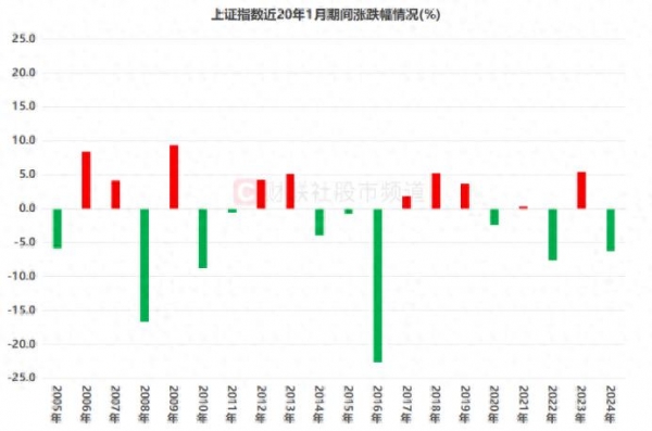 注:上证指数近20年(2005年至2024年)1月期间涨跌幅情况