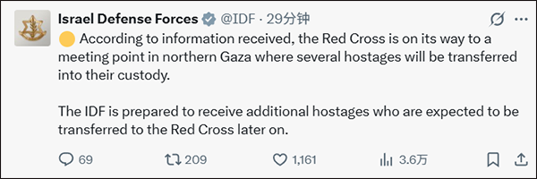 以色列国防军在X平台上分享了该消息,该消息称,红十字会正在前往加沙北部的一个会合点,被转交的几名人质将被转移到那里。