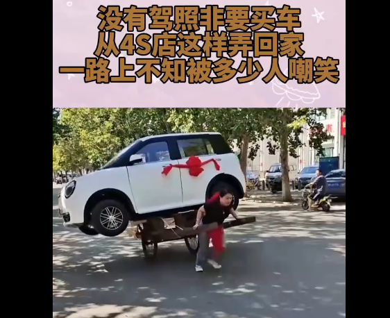 女子没驾照非要买车 从4S店这样弄回家 2025-12-08 15:02 视频种,一女子拉着辆板车拖着新买的车回家,原来女子没有驾照还非要买车,只能这样从4S店把车拖回家。 网友:一路上不知被多少人嘲笑
