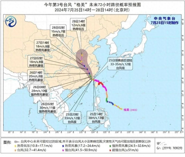 山东省气象台今天发布第3号台风"格美"预报,今年第3号台风"格美"25日15时中心位于福建省福清市南偏东方向约75公里海面上,中心附近最大风力13级(台风级),中心气压965百帕。