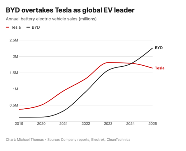 但二十多年后的今天,你再问美国人中国有什么品牌,他们能说出华为、大疆等等,而且最新的大事发生在2025年--谁都没想到,在电动汽车领域,曾经的"王者"特斯拉,一直稳居第一,居然被我们中国的比亚迪超越了。以前特斯拉刚进中国时,谁开特斯拉都觉得特别牛、显得很高贵,甚至有人说那是在"装"。但2025年,比亚迪拿下了全球电动汽车销售冠军,这放在过去简直不敢想象。