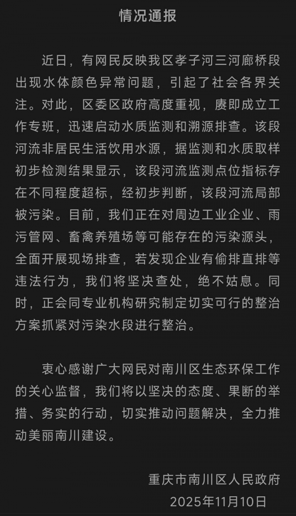 10日晚,南川区人民政府发布官方通报,称已成立工作专班,迅速启动水质监测和溯源排查。