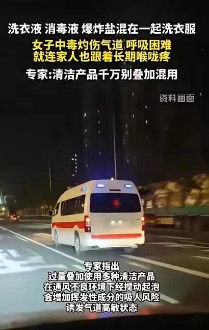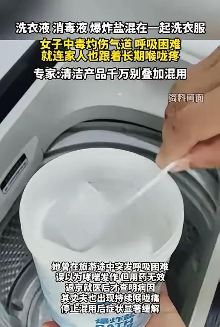 医生解释,不同清洁产品酸碱度、成分不同,消毒液多含氧化性成分,与洗衣液、爆炸盐混合后,相当于在密闭洗衣机内进行小型化学反应,产生的有毒气体会持续损伤呼吸道。女子每次亲手操作,近距离接触高浓度有毒气体,所以症状更严重;丈夫长期处于同一密闭空间,也受到了慢性伤害。