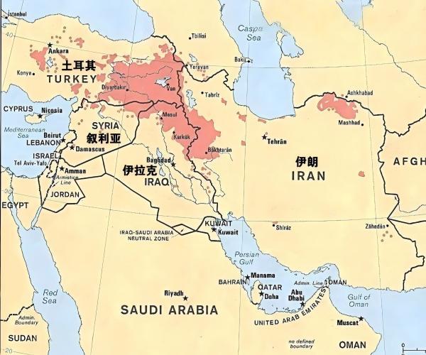 资料图:库尔德人在中东的分布图。红色部分为库尔德人的主要分布区