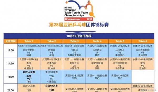北京时间10月13号,2025年第28届亚洲乒乓球团体锦标赛将会在印度继续进行。今天将进行男女团的八强资格赛,和剩余的4场1/4决赛。国乒男女队将在晚上出战,不过对手目前还未确定。