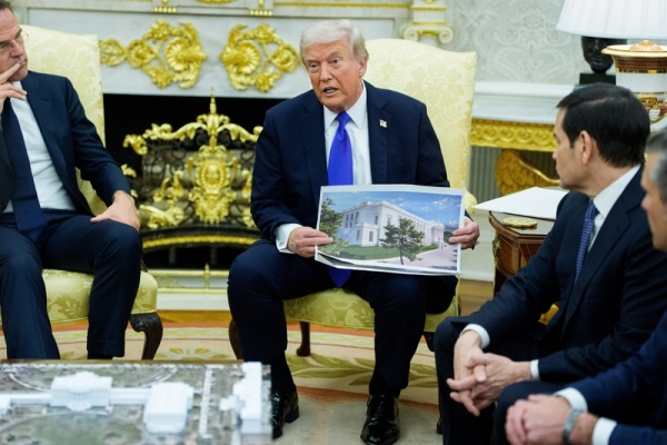 2025年10月22日,特朗普在白宫与北约秘书长吕特会晤,手举宴会厅效果图回应记者提问。 IC Photo
