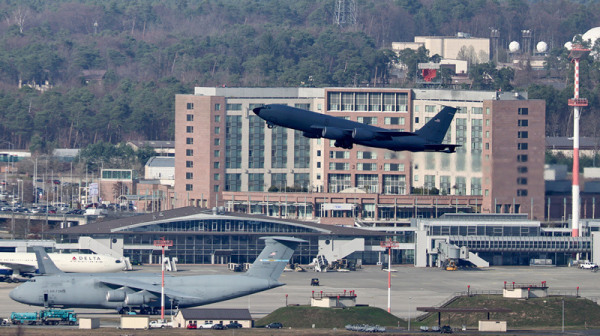 当地时间2026年3月9日,德国兰施图尔附近,一架美国空军飞机从拉姆施泰因空军基地起飞。 IC Photo