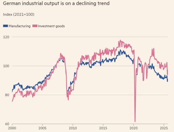 过去二十年,中国对德国工程产品和汽车看似永无止境的需求,曾推动了默克尔时代企业利润、就业和经济活动的增长。然而这一局面已彻底改变,2025年初以来,德国在资本货物领域对中国的12个月滚动贸易逆差,创下2008年有记录以来的首次。