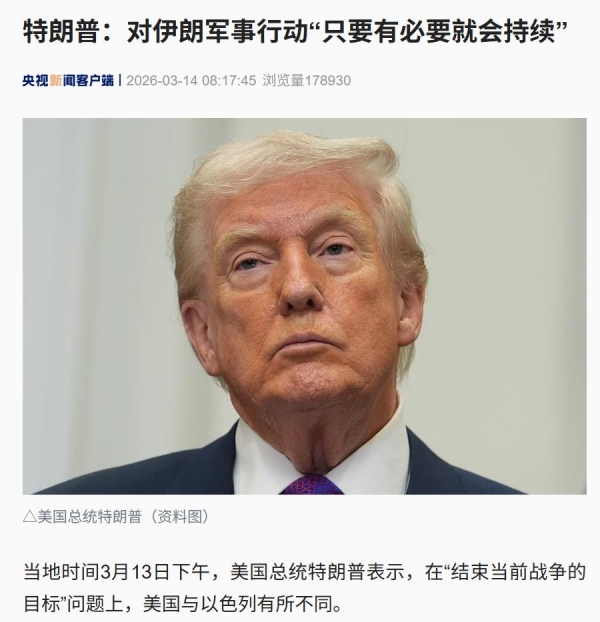 特朗普还表示,美国和以色列在伊朗的目标可能略有不同,"只要有需要,战争将持续"。当被问及对伊朗军事行动可能持续多久时,特朗普表示,"我不能告诉你,我自有考虑",军事行动进展"远远领先于计划","只要有必要就会持续"。