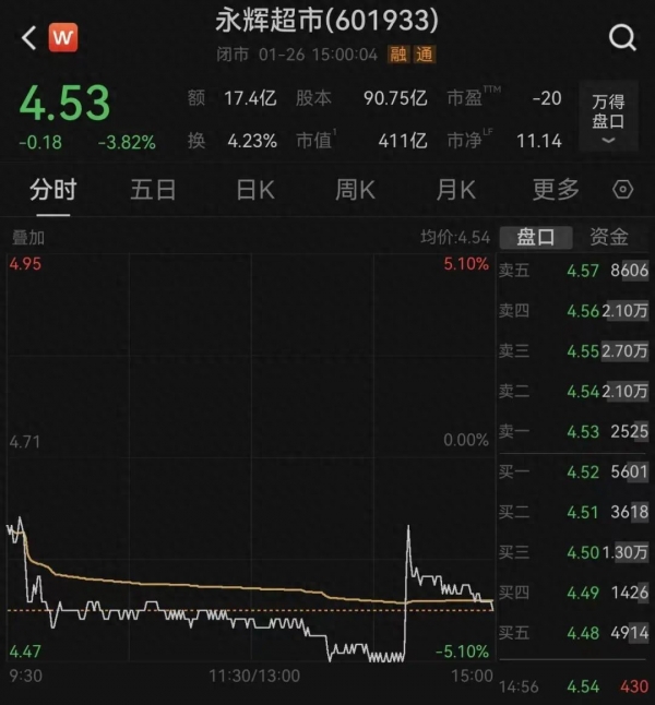 截至1月26日收盘,永辉超市跌3.82%,报4.53元/股,最新总市值411亿元。