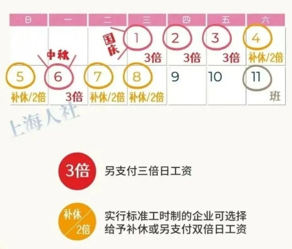 国庆中秋假期中,10月1日、2日、3日、6日属于法定节假日。10月4日、5日、7日、8日,属于放假期间的休息日。国庆假期加班费计算方法为: