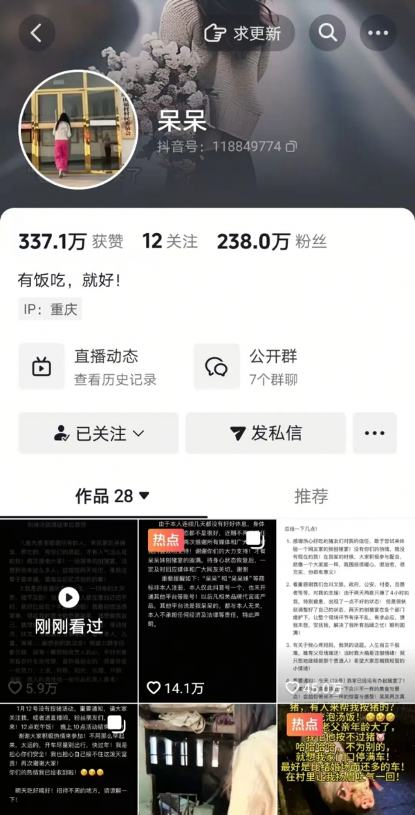 1月16日凌晨,重庆"呆呆"在个人账号发长文:2天的宴席是她最难忘的事,感谢所有人;目前想法很简单,想做帮助他人等有意义的事;暂不签约任何公司;希望大家回归自己生活,让爸妈回归以前生活,不想让他们卷进网络。