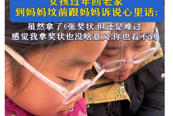 过年本是阖家团圆的日子,小女孩却在思念里想着妈妈。她蹲在妈妈坟前,哽咽着说:"妈妈,我跟你说啊,我今年拿到了6张奖状,里面还有一张三好学生的奖状。"