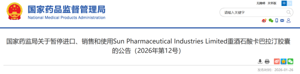 国家药监局关于暂停进口、销售和使用Sun Pharmaceutical Industries Limited重酒石酸卡巴拉汀胶囊的公告(2026年第12号)
