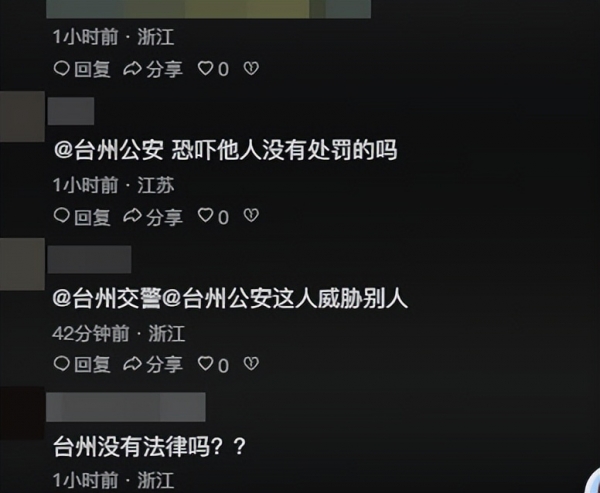 视频被曝光在网络上后,不少网友纷纷在视频下方@台州交警,台州公安,希望官方能给出严肃处理。