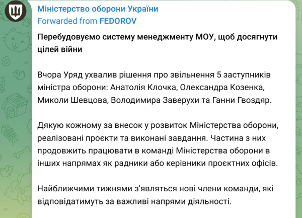 费多罗夫对他们为乌国防部付出的努力表达了感谢。
