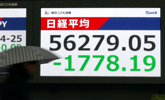 ▲3月3日,东京街头显示屏显示日经225指数收盘暴跌至56279.05点。图/IC photo